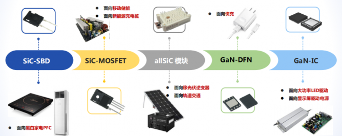 國星光電SiC功率分立器件已形成SiC-SBD及SiC-MOSFET兩條拳頭產(chǎn)品線,擁有TO-247封裝、TO-220封裝、TO-263封裝、TO-252封裝、DFN5*6五種封裝結(jié)構(gòu)。應(yīng)用方面,SiC-SBD重點推廣到黑白家電等領(lǐng)域,而SiC-MOSFET可用于光伏逆變、儲能、充電樁、大型驅(qū)動、UPS不間斷電源等工業(yè)級領(lǐng)域,并向車規(guī)領(lǐng)域靠攏。