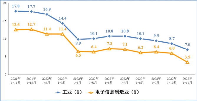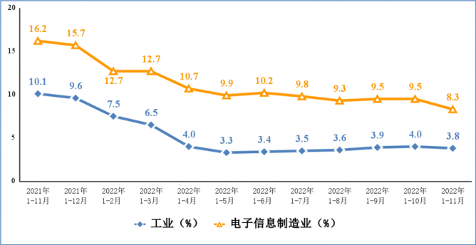 工業(yè)和信息化部運(yùn)行監(jiān)測(cè)協(xié)調(diào)局近日發(fā)布2022年1—11月份電子信息制造業(yè)運(yùn)行情況。1—11月份,我國(guó)電子信息制造業(yè)生產(chǎn)出現(xiàn)放緩,出口增速回落,企業(yè)營(yíng)收持續(xù)增長(zhǎng),投資保持較快增速。