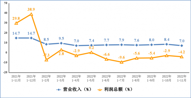 1—11月份,電子信息制造業(yè)實(shí)現(xiàn)營(yíng)業(yè)收入13.9萬(wàn)億元,同比增長(zhǎng)7%,較1—10月份回落1.4個(gè)百分點(diǎn);營(yíng)業(yè)成本12.1萬(wàn)億元,同比增長(zhǎng)7.8%;實(shí)現(xiàn)利潤(rùn)總額6691億元,同比下降4.2%,較1—10月份回落1.3個(gè)百分點(diǎn);營(yíng)業(yè)收入利潤(rùn)率為4.8%,較1—10月份回落0.1個(gè)百分點(diǎn)。