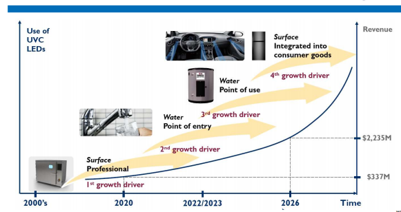 在產(chǎn)能方面,早在2021年下半年,芯片產(chǎn)出已突破 50KK/月,燈珠產(chǎn)能10KK/月,已經(jīng)正式面向市場(chǎng)。在光電轉(zhuǎn)換效率方面上,至芯半導(dǎo)體在全國(guó)都處于領(lǐng)先位置,目前已和不少知名企業(yè)進(jìn)行合作,包括空氣凈化、凈水器、消菌棒、加濕器、母嬰消毒柜、冰箱、空調(diào)等產(chǎn)品都在使用不同型號(hào)及尺寸的深紫外芯片。至芯半導(dǎo)體執(zhí)行總裁黃小輝認(rèn)為,UVC-LED未來(lái)的增長(zhǎng)點(diǎn)主要在水處理、汽車(chē)、空調(diào)等方面。