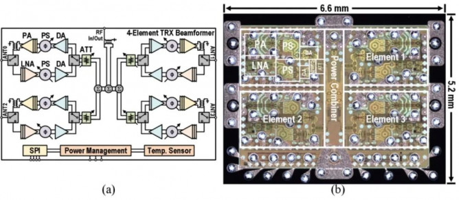 圖1. (a) 5G毫米波四通道相控陣收發(fā)系統(tǒng)射頻前端芯片系統(tǒng)架構(gòu);(b) 芯片顯微照片。