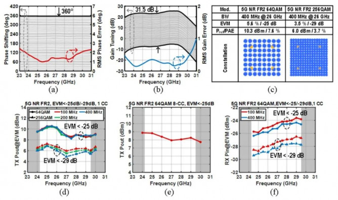 圖2. (a) 6-bit 360° 移相測試結(jié)果;(b) 6-bit 31.5 dB調(diào)幅測試結(jié)果;(c) 26 GHz傳輸400-MHz 64/256-QAM OFDM信號測試;(d) 24-30 GHz發(fā)射100/200/400-MHz 64/256-QAM OFDM信號測試輸出功率;(e) 24-30 GHz發(fā)射8×100-MHz 64-QAM OFDM信號測試輸出功率;(f) 24-30 GHz接收100/400-MHz 64/256-QAM OFDM信號測試輸入功率。
