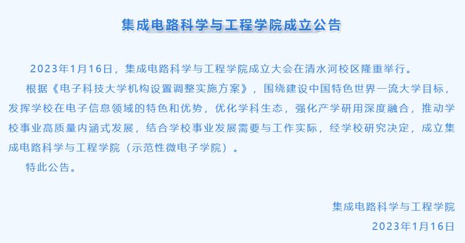 1月16日,電子科技大學(xué)集成電路科學(xué)與工程學(xué)院成立大會(huì)舉行。據(jù)悉,集成電路科學(xué)與工程學(xué)院(示范性微電子學(xué)院)前身可以追溯到1956年成立的無(wú)線(xiàn)電零件系,1986年成立微電子研究所,2015年獲批建設(shè)國(guó)家示范性微電子學(xué)院。
