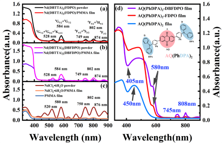 圖1. 室溫下材料吸收譜。 a. Nd(DBTTA)3(FDPO)粉末、Nd(DBTTA)3(FDPO)摻雜PMMA薄膜。b. Nd(DBTTA)3(DBFDPO) 粉末、Nd(DBTTA)3(DBFDPO)摻雜PMMA薄膜。c. NdCl3·6H2O粉末、NdCl3·6H2O摻雜PMMA薄膜作對比。d. AQ(PhDPA)2摻雜PMMA 薄膜、AQ(PhDPA)2與兩種NdⅢ 配合物分別共摻PMMA薄膜。