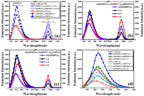 圖2. 室溫下材料的發(fā)射譜。a. 在75 mW 405 nm LED激發(fā)下,NdⅢ 配合物、AQ(PhDPA)2、以及AQ(PhDPA)2與NdⅢ 配合物共摻(1:2)材料的發(fā)射譜。 b和 c. 不同摻雜比例下AQ(PhDPA)2與NdⅢ 配合物共摻的發(fā)射譜(75 mW 405 nm LED激發(fā))。d. 405 和 450 nm LED激發(fā)下,AQ(PhDPA)2、AQ(PhDPA)2 與NdⅢ 配合物共摻材料的發(fā)射譜對比。