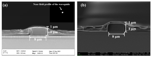 圖4. 倏逝波波導(dǎo)的掃描電鏡圖片(SU-8為通道波導(dǎo))。a. AQ(PhDPA)2與Nd(DBTTA)3(DBFDPO) 共摻PMMA作為上包層,插圖為近場光斑。 b. AQ(PhDPA)2與Nd(DBTTA)3(FDPO) 共摻PMMA作為上包層,厚度約為1μm。
