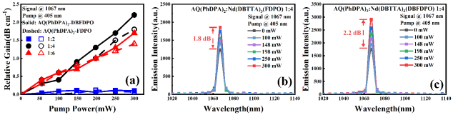 圖5. 波導(dǎo)器件在1067 nm波長的相對增益性能。a. AQ(PhDPA)2與兩種NdⅢ 配合物分別共摻,不同摻雜濃度下波導(dǎo)的相對增益對比。b和c. AQ(PhDPA)2與兩種NdⅢ 配合物的摻雜比例均為1:4時,波導(dǎo)中輸出信號光強度隨405nm LED泵浦功率變化情況。