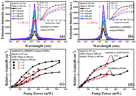 圖6. 450 nm LED激發(fā)下,輸出信號光強度隨泵浦功率變化情況(637 nm)。a. AQ(PhDPA)2與Nd(DBTTA)3(FDPO) 共摻PMMA作為上包層的波導(dǎo)測試結(jié)果。b. AQ(PhDPA)2與Nd(DBTTA)3(DBFDPO) 共摻PMMA作為上包層的波導(dǎo)測試結(jié)果。內(nèi)插為不同摻雜比例下的增益測試結(jié)果。c和d. 405和450 nm LED激發(fā)下的增益結(jié)果對比。