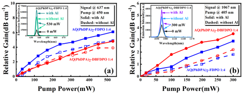 廈門大學(xué)張丹教授、黑龍江大學(xué)許輝教授領(lǐng)導(dǎo)的科研團隊以DBTTA為陰離子配體,以含有二苯基膦氧基團的DBFDPO、FDPO為中性配體,構(gòu)建了兩種釹配合物:Nd(DBTTA)3(DBFDPO)、Nd(DBTTA)3(FDPO),并將其分別與熱激發(fā)延遲熒光分子(Thermally activated delayed fluorescence, TADF)AQ(PhDPA)2共摻,通過有機配體與稀土Nd3+離子的分子內(nèi)能量傳遞、以及配體與AQ(PhDPA)2分子間的能量轉(zhuǎn)移機制,實現(xiàn)了Nd3+離子與AQ(PhDPA)2分子的同步高效發(fā)光;同時,設(shè)計并制備了適合材料的倏逝波結(jié)合鋁反射鏡的硅基聚合物光波導(dǎo),僅靠一個低功率藍(lán)紫光LED泵浦,在截面尺寸為4 × 8 μm 2的波導(dǎo)器件上,實現(xiàn)了637 nm可見光(6.1dB/cm)和1067 nm近紅外光(3.5 dB/cm)的光增益。
