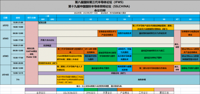 *IFWS相關(guān)會議包括:開幕大會,碳化硅襯底材料生長與加工,碳化硅功率電子材料與器件,氮化物襯底材料生長與外延技術(shù),氮化鎵功率電子材料與器件,固態(tài)紫外材料與器件,化合物半導(dǎo)體激光器技術(shù),Mini/Micro LED及其他新型顯示技術(shù),射頻電子材料與器件,超寬禁帶及其他新型半導(dǎo)體材料與器件,閉幕大會。