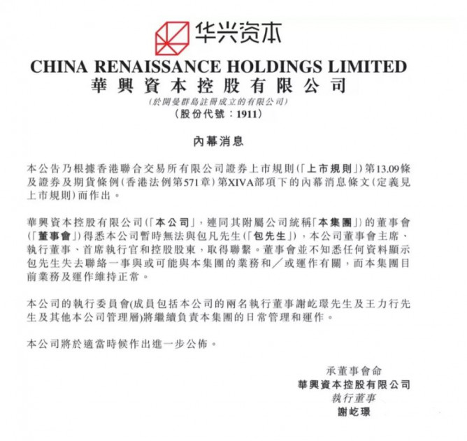 2月16日晚,華興資本控股在港交所公告稱,公司暫時(shí)無法與包凡(公司董事會主席、執(zhí)行董事、首席執(zhí)行官和控股股東)取得聯(lián)系。董事會并不知悉任何資料顯示包先生失去聯(lián)絡(luò)一事與或可能與集團(tuán)的業(yè)務(wù)和/或運(yùn)作有關(guān),集團(tuán)目前業(yè)務(wù)及運(yùn)作維持正常。