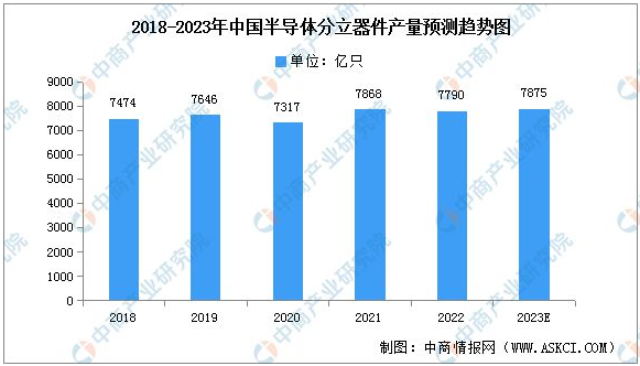 近年來,半導(dǎo)體分立器件的下游物聯(lián)網(wǎng)、可穿戴設(shè)備等新興應(yīng)用領(lǐng)域成為新增長點,2021年我國半導(dǎo)體分立器產(chǎn)量為7868億只,同比增長7.5%,預(yù)計2023年將達7875億只。