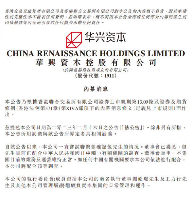 華興資本26日發(fā)布通告稱,公司一直嘗試聯(lián)系并確認(rèn)包凡的情況。董事會已獲悉,包凡目前正配合中國有關(guān)機(jī)關(guān)的調(diào)查。董事會重申,集團(tuán)目前的業(yè)務(wù)及運(yùn)營維持正常。如任何中國有關(guān)機(jī)關(guān)要求本公司依法進(jìn)行配合,公司將配合該等調(diào)查。