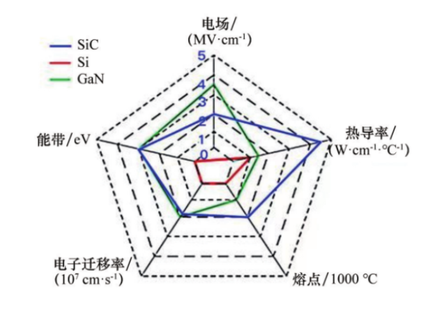 第三代半導(dǎo)體指的是SiC、GaN、ZnO、金剛石(C)、AlN等具有寬禁帶(Eg>2.3eV)特性的新興半導(dǎo)體材料。以第三代寬禁帶功率半導(dǎo)體的典型代表SiC和GaN為例,其材料特性與Si材料的特性對(duì)比如下圖所示: