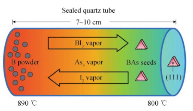 因此很難像GaAs等其他Ⅲ-Ⅴ族半導(dǎo)體材料那樣采用熔體法進(jìn)行晶體生長(zhǎng)。CVT可在密閉環(huán)境下通過(guò)多溫區(qū)精確控溫實(shí)現(xiàn)化學(xué)反應(yīng)控制,有效解決了上述問(wèn)題,是目前開(kāi)展BAs單晶制備研究的主要方法。