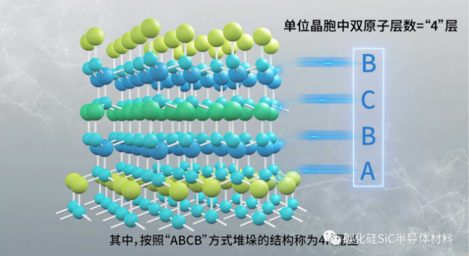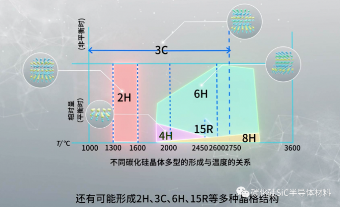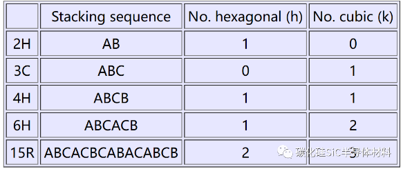 SiC襯底作為一種晶體材料,也具有原子層周期性堆垛的特性。Si-C雙原子層沿著[0001]方向進(jìn)行堆垛,由于層與層之間的鍵能差異小,原子層之間容易產(chǎn)生不同的連接方式,這就導(dǎo)致SiC具有較多種類的晶型。常見晶型有2H-SiC、3C-SiC、4H-SiC、6H-SiC、15R-SiC等。原子層間的排列方式不同,使得組成原子的占位不同,2H晶型中原子全為六方位。而3C晶型中的原子全為立方位。不同占位比會影響晶體的禁帶寬度以及載流子性能。隨著六方位占比增加,禁帶寬度逐漸增大,從3C晶型禁帶寬度的2.4eV到2H晶型的3.2eV。