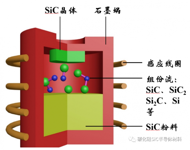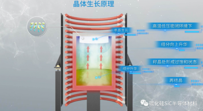 所謂PVT法,是指將SiC籽晶放置在坩堝頂部,將SiC粉料作為原料放置在坩堝底部,在高溫低壓的密閉環(huán)境下,SiC粉料升華,并在溫度梯度和濃度差的作用下向上傳輸至籽晶附近,達(dá)到過飽和狀態(tài)后再結(jié)晶的一種方法。該方法可以實現(xiàn)SiC晶體尺寸和特定晶型的可控生長。