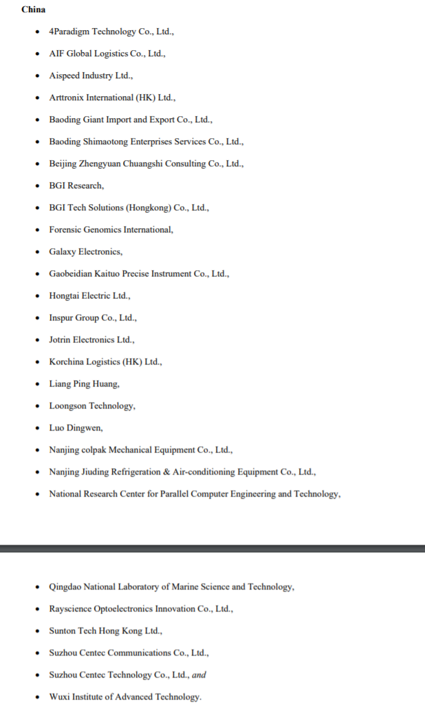 公告稱第四范式科技有限公司(4Paradigm Technology Co.;)、浪潮集團股份有限公司(Inspur Group Co., Ltd.;)、龍芯中科(Loongson Technology)、國家并行計算機工程技術(shù)研究中心(National Research Center for Parallel Computer Engineering and Technology)、青島海洋科學與技術(shù)國家實驗室(Qingdao National Laboratory of Marine Science and Technology)、無錫高等技術(shù)學院(Wuxi Institute of Advanced Technology)因獲取和試圖獲取美國原產(chǎn)物品以支持中國的軍事現(xiàn)代化努力而被列入實體清單。