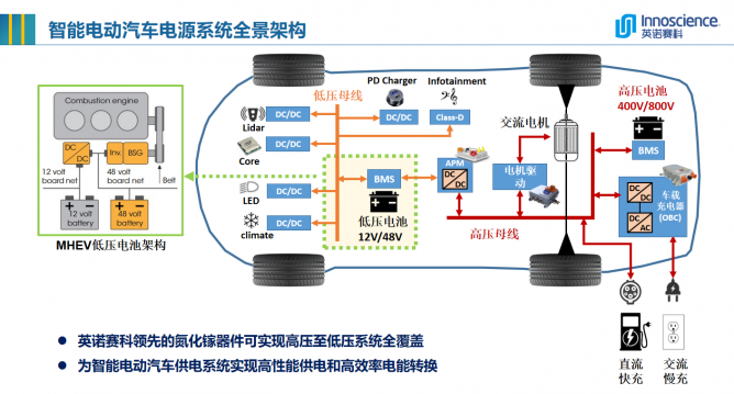 GaN功率器件在智能汽車中的應(yīng)用涉及雙向DC/DC、自動(dòng)駕駛核心電源、PD快充、車載充電器(OBC)、激光雷達(dá)、LED驅(qū)動(dòng)、音響Class-D功放、能量管理系統(tǒng)(BMS)、電機(jī)驅(qū)動(dòng)等環(huán)節(jié)。