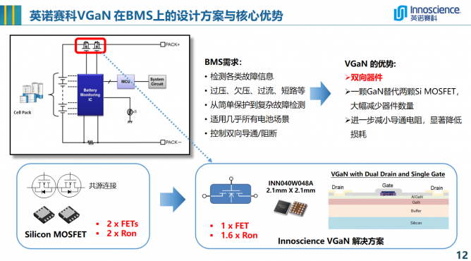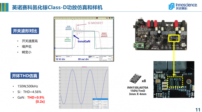 其中,InnoGaN支撐高功率密度/高效率核心供電方案方面,相同功率密度下GaN可實(shí)現(xiàn)更高效率,相同效率下GaN可實(shí)現(xiàn)更高的功率密度。InnoGaN在音響Class-D功放中具有顯著優(yōu)勢(shì),比如高開關(guān)頻率、超低寄生電容、零反向恢復(fù)等。All-GaN車載充電機(jī)(OBC)解決方案中,具有能量雙向流動(dòng)、效率高于Si /SiC MOSFET方案、成本低于SiC MOSFET方案等優(yōu)勢(shì)。All-GaN雙向APM解決方案中具有高開關(guān)頻率、DC/DC級(jí)高功率密度、低壓側(cè)低驅(qū)動(dòng)損耗等優(yōu)勢(shì)。