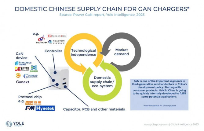 雖然其他地區(qū)的電子 OEM 擁有 GaN 快速充電產(chǎn)品,例如蘋果(美國)和三星(韓國),但在該地區(qū)卓越的制造能力和專用供應(yīng)鏈的支持下,中國 OEM 的數(shù)量要多得多,這使得該地區(qū)能夠在功率 GaN 消費領(lǐng)域占據(jù)主導(dǎo)地位。自 2021 年以來,中國國內(nèi)供應(yīng)鏈已經(jīng)能夠以自下而上的方式支持氮化鎵大批量出貨。該地區(qū)是最大的消費品市場之一,這種需求推動了集成設(shè)備制造商 (IDM) 的發(fā)展,代工廠和包裝商/OSAT。