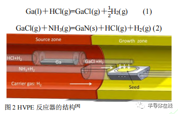HVPE 是基于氣相的生長方法。主要機(jī)理為在 低溫區(qū)(~850 ℃)金屬 Ga 與 HCl 反應(yīng)形成的 GaCl 作為 Ga 源與作為 N 源的 NH3通過 N2和 H2的混合 載氣運(yùn)送到高溫區(qū)(~1040 ℃)的襯底表面在壓力低 于 1 個(gè)大氣壓下反應(yīng)生成 GaN,反應(yīng)公式如下所示 (反應(yīng)器結(jié)構(gòu)如圖 2 所示)。
