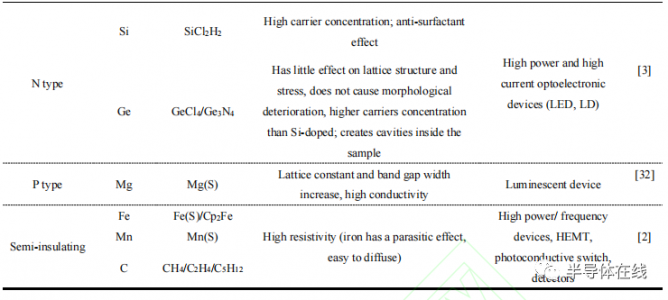 隨著 Si 材料的研究逐漸達(dá)到物理極限,GaN 因 其優(yōu)異的性能被認(rèn)為是未來半導(dǎo)體行業(yè)的首選材料 之一而受到廣泛關(guān)注。GaN 作為第三代寬禁帶半導(dǎo) 體材料,具有耐腐蝕、高擊穿電壓、高電子遷移率 以及高化學(xué)穩(wěn)定性等優(yōu)點(diǎn),是制備激光器(LD)、發(fā) 光二極管(LED)、高電子遷移率晶體管(HEMT)、射 頻器件(RF)以及電力電子器件的理想襯底材料,被 廣泛應(yīng)用于光伏發(fā)電、激光顯示、軌道交通、相控 陣?yán)走_(dá)和 5G 通訊等生產(chǎn)生活以及國防安全領(lǐng)域。相比于其它的 GaN 制備方法,HVPE 方法因其快速 的生長速率、溫和的生長條件以及低廉的生長成本,具有廣泛的應(yīng)用前景,是目前研究重點(diǎn)之一。由于 HVPE 中石英腔的普遍使用,非摻雜 GaN 中存在固 有施主雜質(zhì)(Si、O),使其表現(xiàn)為 n 型導(dǎo)電性質(zhì),往 往引起寄生電壓、電流泄漏等問題,并且由于電阻 率低,波動(dòng)范圍大的原因,使其不適合直接應(yīng)用于 實(shí)際器件的制造方面。通過制備過程中不同摻雜劑 作為摻雜源的使用,可以獲得不同類型的摻雜 GaN, 改善其電學(xué)性能,擴(kuò)展應(yīng)用范圍(見表 1);通過 Si 摻雜和 Ge 摻雜可以獲得 n 型 GaN,把 GaN 的載流 子濃度提高到 1018 cm-3 以上,滿足高功率(光電和電 子)垂直器件的需求;利用 Mg 摻雜獲得的 p 型 GaN, 由于其獨(dú)特的光電性能可用于發(fā)光器件的制作;利 用 Fe、C 等深受主雜質(zhì)制備獲得的高電阻半絕緣 GaN 具有用于制造橫向?qū)щ娖骷臐撛谀芰Γ?HEMT,其制備工藝簡單,性能優(yōu)異,并提高了器 件長期運(yùn)行的可靠性,具有十分廣泛的應(yīng)用前景, 成為科研工作者的研究重點(diǎn)。