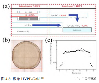 Si 摻雜和 Ge 摻雜是實(shí)現(xiàn) n 型 GaN 最為常見的 方式。在 HVPE 中,Si 摻雜源的選擇有很多。首先, 像 MOVPE 一樣,可以考慮硅烷等氣體源,但是由 于硅烷的熱穩(wěn)定性較差,到達(dá)襯底之前就會迅速分 解,不是 Si 摻雜的最優(yōu)選擇;可以使用固體 Si 作為 摻雜源與 HCl 進(jìn)行反應(yīng)生成 SiHCl3,在高溫下,轉(zhuǎn) 變?yōu)?SiCl2,然后被運(yùn)輸?shù)缴L區(qū),由于 Si 片在反 應(yīng)后形貌發(fā)生變化影響摻雜量的控制,Lipski F通過 HVPE 以 Si-Ga 溶液同時(shí)作為 Si 源和 Ga 源成 功制備獲得 Si 摻雜 GaN;SiH2Cl2 具有更高的熱穩(wěn) 定性,目前以 SiH2Cl2 作為最為普遍的摻雜源,利用 HVPE 生長得到的 GaN 具有良好的晶體質(zhì)量 (設(shè)備結(jié)構(gòu)見圖 4(a))。Si 原子是 GaN 中的淺施 主,可以提高 GaN 的費(fèi)米能級,因此,較高的 Si 摻雜濃度可以提高歐姆接觸的性能。而且適當(dāng)?shù)?Si 摻雜不會影響獲得的 HVPE-GaN 晶體的高結(jié)構(gòu)質(zhì)量。但是 Si 雜質(zhì)具有抗表面活性劑效應(yīng),隨著摻雜濃度 的升高會使 GaN 表面形成單原子層 SiGaN3,引入 排斥性的電偶極矩,阻礙 GaN 在表面的繼續(xù)生長, 導(dǎo)致表面形貌惡化,進(jìn)而限制了 Si 濃度的提高。由于 Si 原子與線位錯(cuò)之間的相互作用,Si 摻雜還會 導(dǎo)致GaN材料中的位錯(cuò)在位錯(cuò)攀升過程中發(fā)生傾斜,從而引入張應(yīng)力并導(dǎo)致 GaN 出現(xiàn)翹曲、開裂等 問題,降低了臨界層厚度。Si 摻雜引起的拉伸應(yīng) 變廣泛存在于 GaN、AlGaN 和 AlN 中,這與所使用 的生長技術(shù)無關(guān)。位錯(cuò)密度越低,Si 摻雜和載流子 濃度對拉伸應(yīng)力的影響就越弱。采用高質(zhì)量籽晶 作為襯底可以有效降低 GaN 材料的位錯(cuò)密度,減少 傾斜位錯(cuò)的存在,從而緩解 Si 摻雜 GaN 內(nèi)部的張 應(yīng)力。Xia 等研究發(fā)現(xiàn)在相同的載流子濃度下, Si摻雜的高質(zhì)量體塊GaN的遷移率優(yōu)于具有較高位 錯(cuò)密度的 GaN 襯底。用 Si 進(jìn)行摻雜可以獲得自由 載流子濃度在 c 平面上非常均勻的高導(dǎo)電 n 型 HVPE-GaN 晶體(見圖 4(b, c),載流子濃度僅在晶 片邊緣存在細(xì)小偏差)。
