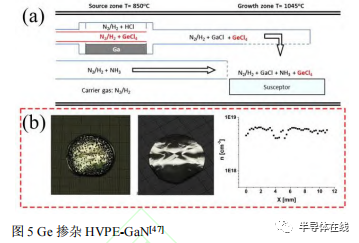 除 Si 外,Ge 是一種非常有前途的 n 型 GaN 摻 雜原子,與 Si 摻雜相比,Ge 是 GaN 生長過程中的 一種表面活性劑,其摻雜并沒有增加位錯(cuò)密度可以 防止生長過程中表面形態(tài)的惡化。Ge 的原子半 徑接近 Ga 原子,Ge 雜質(zhì)的加入對于 GaN 晶格結(jié)構(gòu) 和應(yīng)力的影響要小于 Si 雜質(zhì)。GeCl4 是 GaN 生長中 Ge 摻雜源的杰出選擇(設(shè) 備結(jié)構(gòu)見圖 5(a)),Iwinska 等發(fā)現(xiàn)在 H2 環(huán)境生長 過程中,由于在生長的晶體表面形成 Ge 液滴(Ge 的 熔點(diǎn)低于 950 ℃),阻礙晶體的生長,從而導(dǎo)致晶體 中形成凹坑,凹坑密度隨著 Ge 濃度的增加而增加, 當(dāng)停止供應(yīng) Ge 前驅(qū)體時(shí),凹坑可能會橫向過生長, 對相應(yīng)性能產(chǎn)生影響,以 N2 氣為載氣在結(jié)晶過程 中可以不受其干擾,獲得高質(zhì)量的 Ge 摻雜 GaN(自 由載流子分布均勻無波動(dòng)) (見圖 5(b))。位錯(cuò)傾斜 并不依賴于摻雜劑的種類,與 Si 一樣,Ge 對于 n 型 GaN 的應(yīng)力演變具有相同的影響,也會在外延生 長過程中出現(xiàn)引發(fā)拉伸應(yīng)力的位錯(cuò)傾斜,這主要是 由于 Ga 空位的上升所引起的。Oshima 團(tuán)隊(duì)以 GeCl4 為摻雜源,利用 HVPE 生長獲得 GaN 晶體表 明即使在高 Ge 摻雜濃度下 GaN 仍然具有優(yōu)異的性 能,是一種非常具有發(fā)展前景的 n 型 GaN 制備方法。通過 Si 摻雜和 Ge 摻雜可以把 GaN 的載流子濃 度提高到 1018 cm-3 以上,滿足高功率(光電和電子) 垂直器件的需求;通過對 n 型 GaN 的生長與研究, 有助于 GaN 性能的進(jìn)一步開發(fā)與完善,其中降低位 錯(cuò)密度緩解生長過程中的應(yīng)力對于 n 型 GaN 制備高 可靠性、高性能電子光電器件至關(guān)重要,對于 GaN 晶體應(yīng)用具有重要推動(dòng)作用。