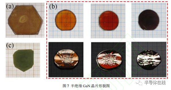 高電子遷移率晶體管(High electron mobility transistor, HEMT)等器件必須在半絕緣 GaN 基底上 進(jìn)行制備,以克服寄生電容引起的信號損失。HVPE生長半絕緣 GaN 有兩種方法。大多數(shù) HVPE 設(shè)備使 用石英部件,無意中加入了 Si 和 O,產(chǎn)生了 n 型電 導(dǎo)率,因此可以通過設(shè)計(jì)新型 HVPE 設(shè)備去除反應(yīng) 器中的石英以獲得高純度 GaN 晶體提高電阻率;在 另一種方法中,可以有意地添加深能級摻雜劑來補(bǔ) 償無意的自由電子,一般是用深能級雜質(zhì)(Fe、Mn、 C)補(bǔ)償背景淺施主(Si 雜質(zhì)和 O 雜質(zhì))來實(shí)現(xiàn) (相應(yīng)半絕緣 GaN 晶片形貌見圖 7),高濃度的淺施主需 要更高濃度的補(bǔ)償雜質(zhì),這可能會降低材料的固有 性質(zhì),因此降低晶體中的本征供體雜質(zhì)濃度也至 關(guān)重要。