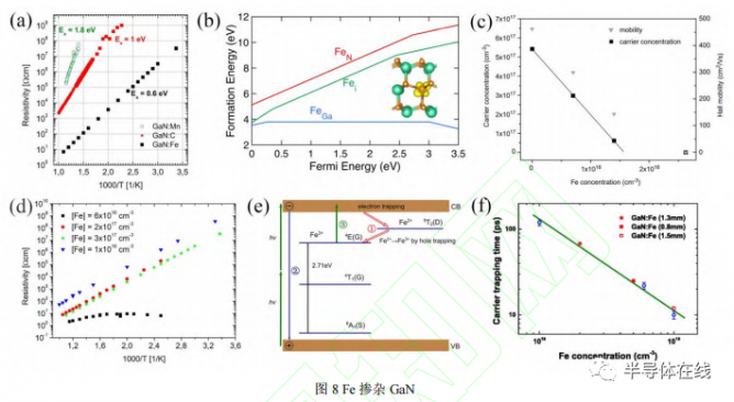 Bockowski 等測量了 GaN 中 Mn、C、Fe 摻雜 劑的深受體能級的活化能,分別為 1.8、1 和 0.6 eV, 摻 Mn 電阻率最高,摻 Fe 電阻率最低(見圖 8(a))。