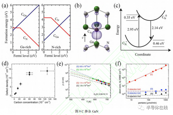 C 是另一種較好的半絕緣 GaN 摻雜劑,HVPE 中常以 CH4、C2H4、C5H12等含 C 氣體作為摻雜源。眾所周知,在 GaN 中的 C 雜質(zhì),不僅作為供體,而 且作為受體(不同環(huán)境下 CGa 和 CN 的形成能與費(fèi)米 能級的關(guān)系見圖 9(a)),當(dāng) C 濃度低于 1×1019 cm-3 時(shí),C 原子在 GaN 晶體結(jié)構(gòu)中占據(jù) N 原子位置 (CN)(見圖 9(b)),表現(xiàn)為深層受體,然而,隨著 C 摻雜濃度的過量,在 GaN 中形成了大量的 Ga 位 C(CGa)作為供體,補(bǔ)償 CN,從而降低深層受體的濃 度。CN在 2.2 eV 附近產(chǎn)生黃色發(fā)光帶,在 2.9 eV 附 近 產(chǎn) 生 藍(lán) 色 發(fā) 光 帶 (CN 躍 遷 發(fā) 光 過 程 見 圖 9(c))。C 摻雜雖然會產(chǎn)生與摻雜濃度相關(guān)的缺 陷(見圖 9(d)),但不會對 GaN 晶體的應(yīng)力和位錯(cuò) 增值產(chǎn)生影響,即使 C 雜質(zhì)濃度超過 1×1019 cm-3, GaN 材料也能保持良好的晶體質(zhì)量,,適度的碳 摻雜甚至可能通過更強(qiáng)地降低邊緣位錯(cuò)密度來提高 晶體質(zhì)量。通過控制 C 前驅(qū)體的輸入分壓調(diào)控 C 摻雜濃度可以獲得高達(dá) 1010 Ω·cm 的室溫電阻率(見圖 9(e, f))。此外,有詳細(xì)的光電離光譜學(xué)研究表明, C 雜質(zhì)與 HEMT 設(shè)備中的陷阱中心相關(guān),會導(dǎo)致設(shè) 備的電流崩塌,CN作為一個(gè)深層受體補(bǔ)償 n 型背 景雜質(zhì),從而抑制高電場下的泄漏電流,提高擊穿 電壓;當(dāng)摻雜濃度過量,深能級受體對 n 型背景雜 質(zhì)的補(bǔ)償受到 CGa-CN自補(bǔ)償效應(yīng)的抑制,從而導(dǎo)致 擊穿電壓的降低。