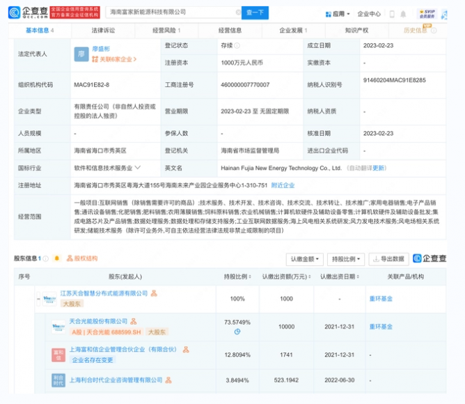 企查查APP顯示,近日,海南富家新能源科技有限公司成立,法定代表人為廖盛彬,注冊資本1000萬元人民幣,經(jīng)營范圍包含:集成電路芯片及產(chǎn)品銷售;工業(yè)互聯(lián)網(wǎng)數(shù)據(jù)服務(wù);海上風電相關(guān)系統(tǒng)研發(fā);儲能技術(shù)服務(wù)等。企查查股權(quán)穿透顯示,該公司由天合光能(688599)等間接共同持股。