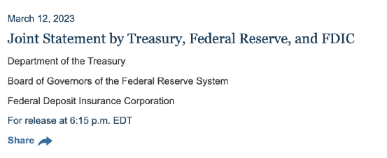 美國(guó)財(cái)政部長(zhǎng)珍妮特·耶倫、聯(lián)邦儲(chǔ)備委員會(huì)主席杰羅姆·H·鮑威爾和 FDIC 主席馬丁·J·格倫伯格發(fā)表了以下聲明:
