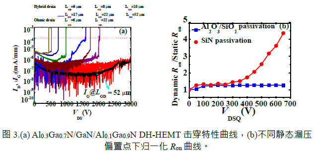 為了進一步提高 DH-HEMT 的性能,在這項研究中,我們設計了一種具有歐姆 / 肖 特 基 復 合 漏 極 結(jié) 構 和 Al2O3/SiO2 疊 層 鈍 化 結(jié) 構 的Al0.3Ga0.7N/GaN/Al0.1Ga0.9N DH-HEMT,如圖 1 所示,該器件具有 10-8 mA/mm 的低泄漏電流、超過1010 的高開關比和較低的亞閾值擺幅 63 mV/dec。如圖 2 所示,在 200℃的高溫測試條件下,該器件仍具有 109 的高開關比,在柵偏壓為-20V、-10V 和 2 V 時,器件的閾值電壓漂移量小于 0.25 V,該器件表現(xiàn)出良好的高溫特性和閾值電壓的穩(wěn)定性。此外,如圖 3 所示,所制備的器件具有超過3000 V的高擊穿電壓和極低的關態(tài)功耗,在 650 V 的靜態(tài)漏壓偏置點下,器件的動態(tài)導通電阻退化量被抑制在 30%以下。這些優(yōu)異的結(jié)果表明該器件在高溫、大功率應用中具有巨大潛力。