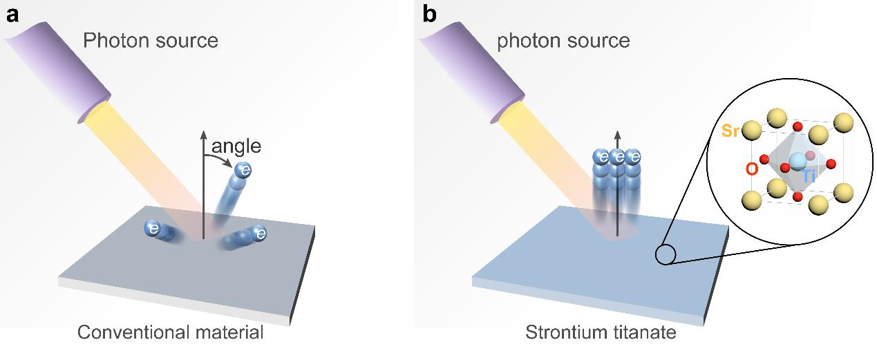 普通光陰極材料(a)和光陰極量子材料鈦酸鍶(b)所發(fā)射的初始電子束的區(qū)別。