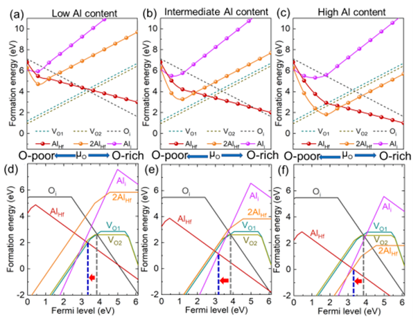 本項(xiàng)工作從實(shí)驗(yàn)和理論相結(jié)合的角度出發(fā),探究了摻雜變化對(duì)氧化鉿薄膜鐵電特性影響的原因。實(shí)驗(yàn)發(fā)現(xiàn)在氧化鉿薄膜中摻雜2.4%的鋁,器件具有較好的鐵電特性。并通過(guò)第一性原理分析的方法進(jìn)行分析解釋?zhuān)l(fā)現(xiàn)過(guò)多鋁的摻雜將會(huì)生成氧化鋁從而破壞鐵電相的穩(wěn)定,但是鋁的不足以產(chǎn)生大的內(nèi)應(yīng)力從而穩(wěn)定薄膜中的正交相。這項(xiàng)研究有助于推動(dòng)集成電路領(lǐng)域中新型低功耗微納電子器件開(kāi)發(fā)與應(yīng)用。