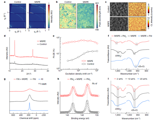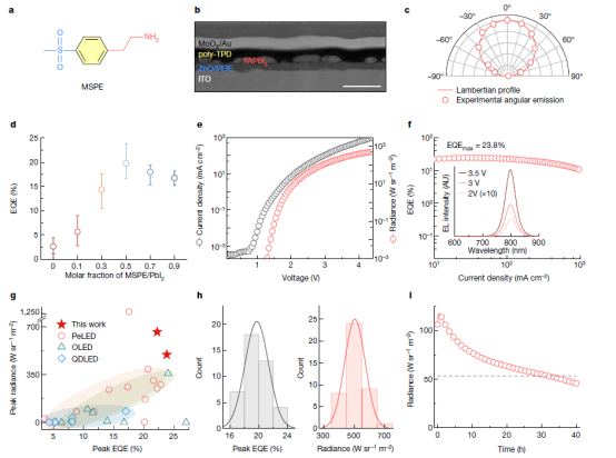 針對(duì)以上問題,團(tuán)隊(duì)設(shè)計(jì)開發(fā)了一種多功能分子穩(wěn)定劑2-(4-甲砜基苯基)乙胺(MSPE)用來精準(zhǔn)調(diào)控鈣鈦礦材料的光電性能、晶體行為和形態(tài)學(xué)性質(zhì),大幅提升鈣鈦礦LED在高亮度下的效率和穩(wěn)定性(圖一)。MSPE通過氫鍵和配位鍵與鈣鈦礦中的組分相互作用,有效調(diào)控鈣鈦礦的結(jié)晶生長(zhǎng)過程,提高了薄膜的結(jié)晶性和晶粒的規(guī)整性(圖二),并實(shí)現(xiàn)對(duì)鈣鈦礦表/界面缺陷有效鈍化,大幅提升鈣鈦礦薄膜的發(fā)光效率和發(fā)光均一性(圖三);另一方面,MSPE分子間通過氫鍵誘導(dǎo)形成自組裝結(jié)構(gòu),抑制了傳輸層界面低能態(tài)的形成,消除了傳輸層界面對(duì)鈣鈦礦材料發(fā)光的淬滅(圖四)。得益于MSPE對(duì)鈣鈦礦和傳輸層界面的協(xié)同鈍化效應(yīng),實(shí)現(xiàn)了高亮度、高效率和高穩(wěn)定性的近紅外(~800 nm)鈣鈦礦LED。器件峰值EQE高達(dá)23.8%,并且在1000mA cm−2的電流密度下,器件的EQE仍能超過10%,表現(xiàn)了超高的效率穩(wěn)定性。在脈沖工作模式下,當(dāng)電流密度高達(dá)4000mA cm−2時(shí),此時(shí)器件的EQE仍超過16%,并且亮度達(dá)到3,200 W s−1m−2。值得注意的是,在初始亮度為107 W s−1m−2下,器件的壽命可以達(dá)到32小時(shí)以上,是目前穩(wěn)定性最好的鈣鈦礦LED器件之一,在當(dāng)前EQE超過20%的近紅外鈣鈦礦中處于領(lǐng)先水平。在高亮度下,實(shí)現(xiàn)高效穩(wěn)定的鈣鈦礦LED是邁向商業(yè)化關(guān)鍵一步,并有望在未來進(jìn)一步實(shí)現(xiàn)鈣鈦礦電泵浦激光器展示了巨大潛力。
