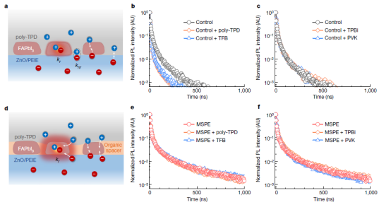圖四:鈣鈦礦/電荷傳輸層異質(zhì)結(jié)的時(shí)間分辨光譜分析