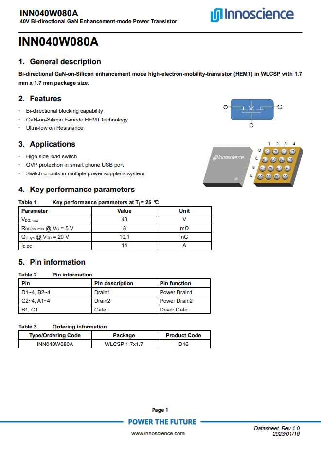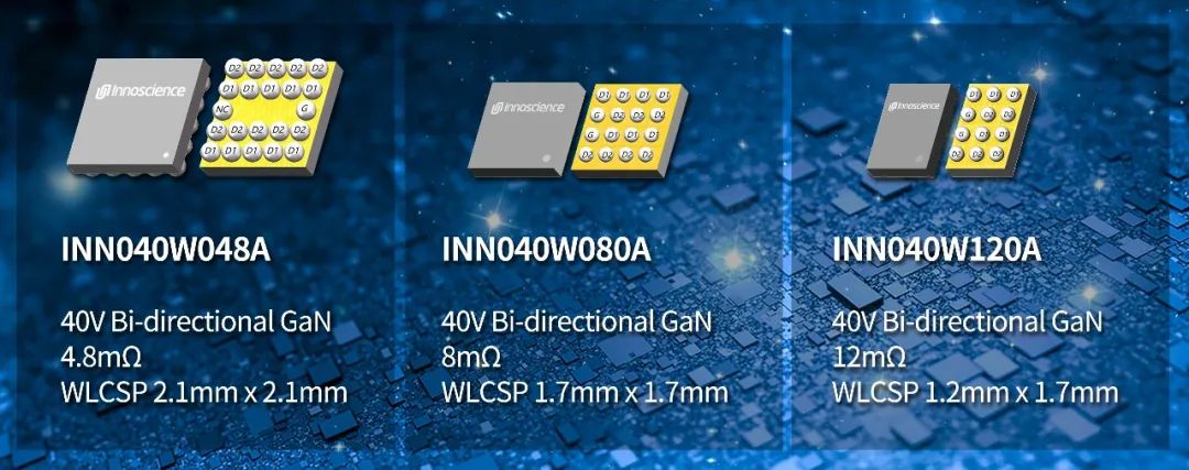 2022年,英諾賽科開創(chuàng)了氮化鎵 40V 器件平臺,并率先將雙向?qū)?VGaN INN040W048A(40V/4.8mΩ)產(chǎn)品成功導入Oppo、Realme 手機主板內(nèi)部,實現(xiàn)體積減少64%,峰值功率發(fā)熱降低85%等優(yōu)越性能表現(xiàn),獲得了良好的市場反饋?;?0V 平臺的迭代與升級,近期,英諾賽科 VGaN 家族迎來了兩名新成員:INN040W080A、INN040W120A。