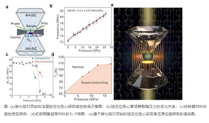 該實(shí)驗(yàn)發(fā)展了基于固態(tài)色心自旋的高壓原位磁探測(cè)技術(shù)。相對(duì)于金剛石,碳化硅材料加工工藝成熟,可大尺寸生長和制備,價(jià)格便宜,其制備的壓砧在低壓區(qū)可以提供更大的樣品體積。在這些碳化硅壓砧中集成磁傳感器為高壓超導(dǎo)磁探測(cè)以及磁性材料相變研究提供了一個(gè)優(yōu)異的研究平臺(tái)。