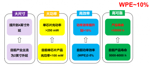 氮化物半導體是實現(xiàn)紫外發(fā)光器件的優(yōu)選材料,報告指出大功率深紫外LED電光轉(zhuǎn)換效率(WPE)普遍<5%,嚴重制約了深紫外 LED 的應用與推廣。面臨著深紫外LED性能提升需要攻克從核心材料、芯片工藝到器件封裝的系列問題,材料質(zhì)量方面,外延層的位錯密度高,紫外LED的內(nèi)量子效率指數(shù)下降;光吸收和歐姆電極問題;封裝導致的光提取和可靠性問題等技術(shù)挑戰(zhàn)。報告詳細分享了NPSS外延、應力控制、高溫退火AlN模板、高質(zhì)量AlGaN外延、透明p型層、高反射電極、光提取、壽命、集成封裝、芯片性能等技術(shù)進展與成果。