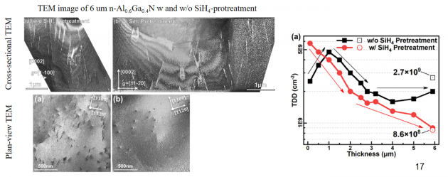 SiH4預處理技術(shù),在生長AlGaN之前預通SiH4可促進AlGaN的3D生長,并加快3D to 2D的生長模式轉(zhuǎn)變及表面合并,獲得平整的高質(zhì)量nAlGaN薄膜。