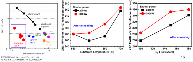 濺射+高溫退火制作AlN模板方面,濺射提供原子空位,使得位錯在高溫退火過程中實現(xiàn)快速攀移并湮滅,最終可以在較低厚度下獲得高質(zhì)量AlN模板。