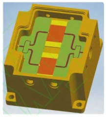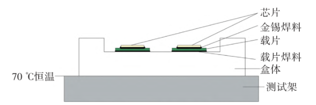 本文研究對象是 Ku 波段 GaN 功率合成放大器,該放大器用于衛(wèi)星通信發(fā)射單元的末級功率輸出,熱耗較大。在連續(xù)波工作條件下,熱耗為 53 W。放大器的封裝結(jié)構(gòu)模型如圖 1 所示,模型主要包括兩個(gè) GaN 功率芯片、Au80Sn20 焊接層、載片、印制電路板(PCB)、In80Pb15Ag5 焊接層和盒體。