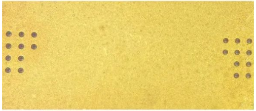 本實(shí)驗(yàn)采用高熱導(dǎo)率的金剛石作為載片,金剛石載片由中國電子科技集團(tuán)公司第十三研究所專用集成電路重點(diǎn)實(shí)驗(yàn)室提供,厚度為 0.3 mm,熱導(dǎo)率為 2000 W/(m·K),表面粗糙度在 2 nm 以內(nèi),達(dá)到國內(nèi)領(lǐng)先水平,金剛石載片照片如圖 3 所示。由于金剛石本身是絕緣材料,利用通孔電鍍方式實(shí)現(xiàn)導(dǎo)通接地,同時(shí)解決了金剛石表面可焊性鍍層的制備問題,金剛石載片與 Au80Sn20 焊料潤濕性良好,空洞率控制在 5%以內(nèi)。