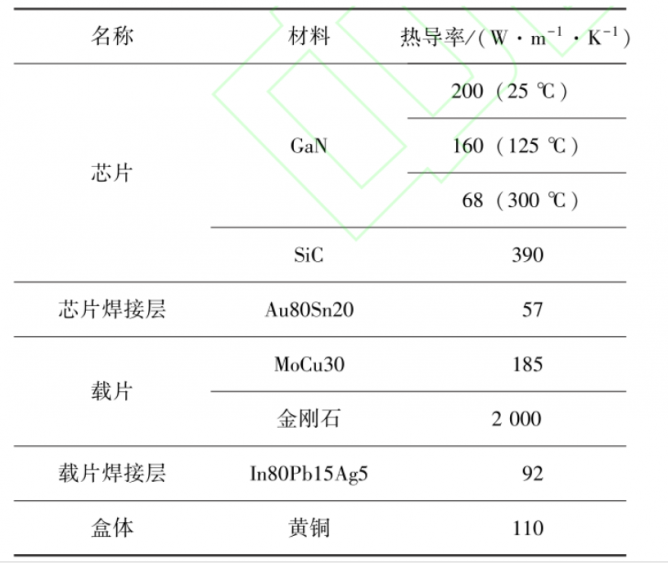 在圖 1 所示的封裝結(jié)構(gòu)中,GaN 功率芯片襯底為 SiC 材 料,芯片尺寸為 5.0 mm×6.65 mm×0.08 mm,有源區(qū)面積為 4.28 mm2,芯片與載片通過 Au80Sn20 焊料連接;載片尺寸為 5.0 mm×10.6 mm×0.3 mm,載片與盒體通過 In80Pb15Ag5 焊料連接。仿真模型中焊料層與實(shí)測器件保持一致,厚度為 0.05 mm,界面接觸系數(shù)按照 5%空洞率設(shè)置。計(jì)算模型采用六面體進(jìn)行網(wǎng)格劃分,網(wǎng)格總數(shù)約為 30 萬。模型中各部分材料參數(shù)如表 1 所示。