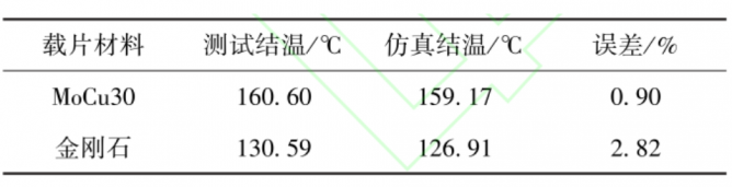 由于實(shí)際測試時(shí),散熱器通過導(dǎo)熱硅脂與盒體相連,不可能達(dá)到理想恒溫條件,因此仿真散熱效果要優(yōu)于實(shí)際測試結(jié)果。將實(shí)測數(shù)據(jù)與仿真數(shù)據(jù)進(jìn)行對比,可知仿真值與實(shí)測值誤差在 3%之內(nèi),如表 2 所示。實(shí)測和仿真結(jié)果的一致性驗(yàn)證了采用金剛石載片的器件結(jié)溫更低,散熱能力更好。