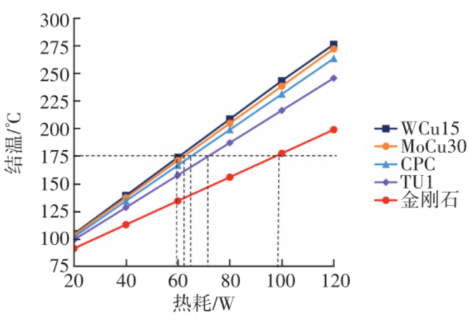 圖 6 采用不同載片材料的芯片結(jié)溫隨熱耗的變化曲線