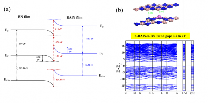 圖1. h-BN/Bportant; overflow-wrap: break-word !important;">0.89Alportant; overflow-wrap: break-word !important;">0.11N異質結的電學能帶匹配:理論預測與實驗驗證的type-II能帶結構。